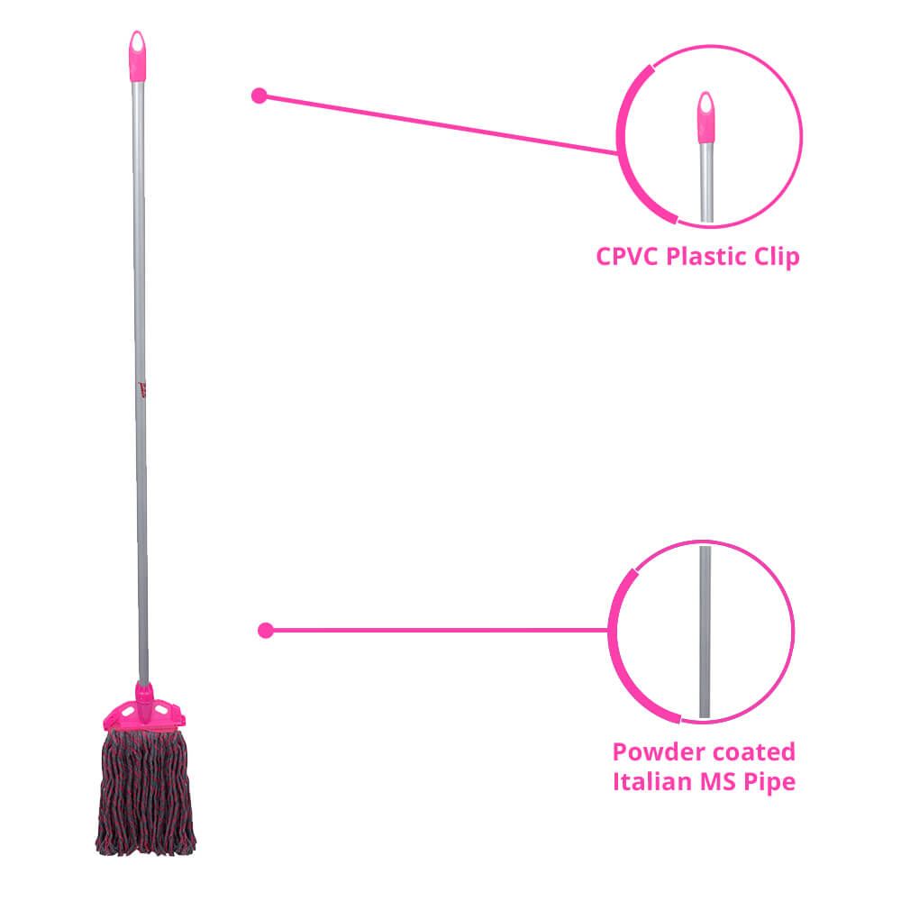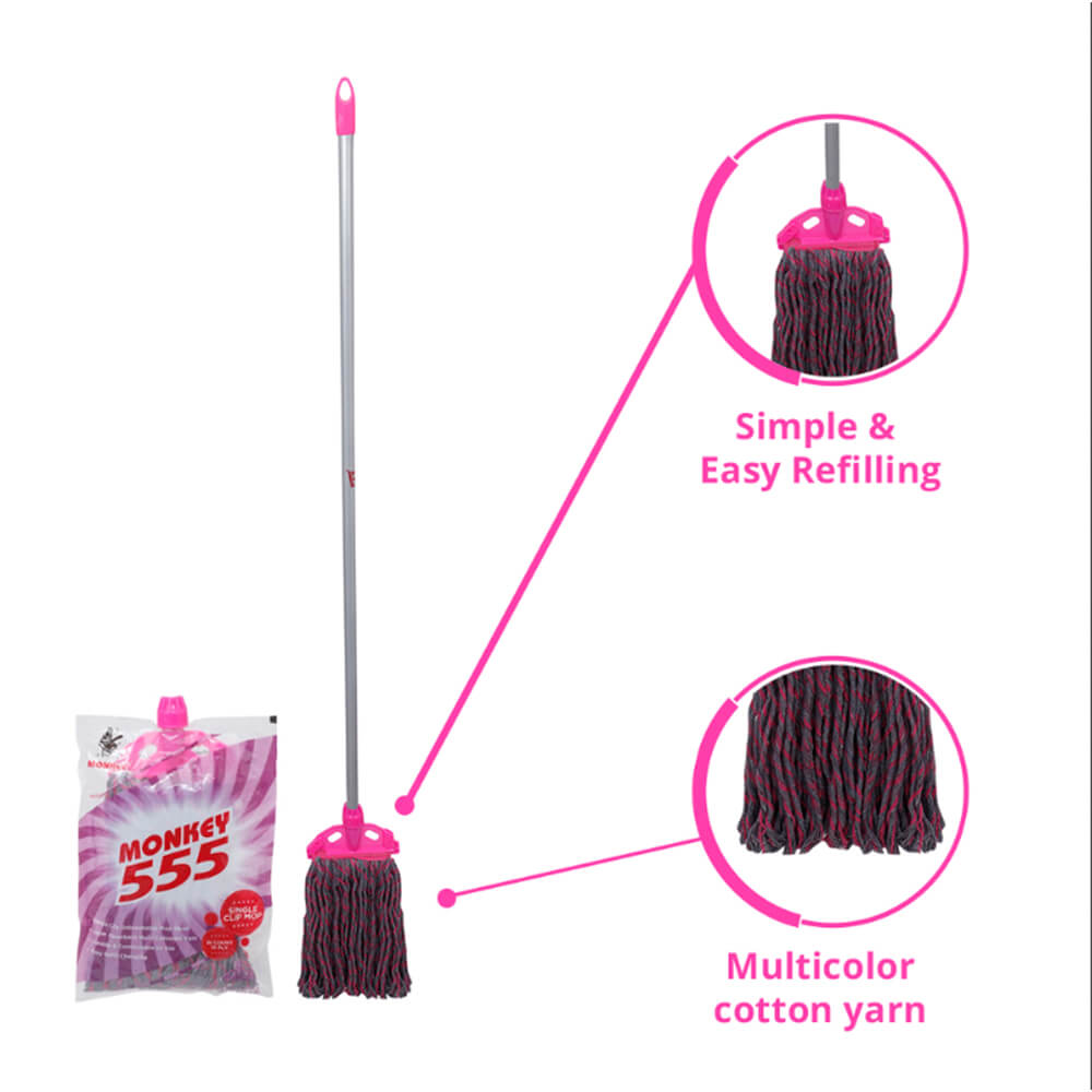 The Monkey 555 Single Clip Mop is designed for effortless cleaning and convenience. Made with durable multicolor cotton yarn and a sturdy CPVC plastic clip, it ensures long-lasting performance and easy refill changes. Its powder-coated Italian MS pipe provides excellent grip and durability, making it perfect for both wet and dry cleaning. The superior 2S count, 12 PLY yarn delivers effective absorption and cleaning efficiency, ensuring spotless floors with minimal effort. Ideal for homes and offices, this mop combines comfort, strength, and ease of use in one smart design.